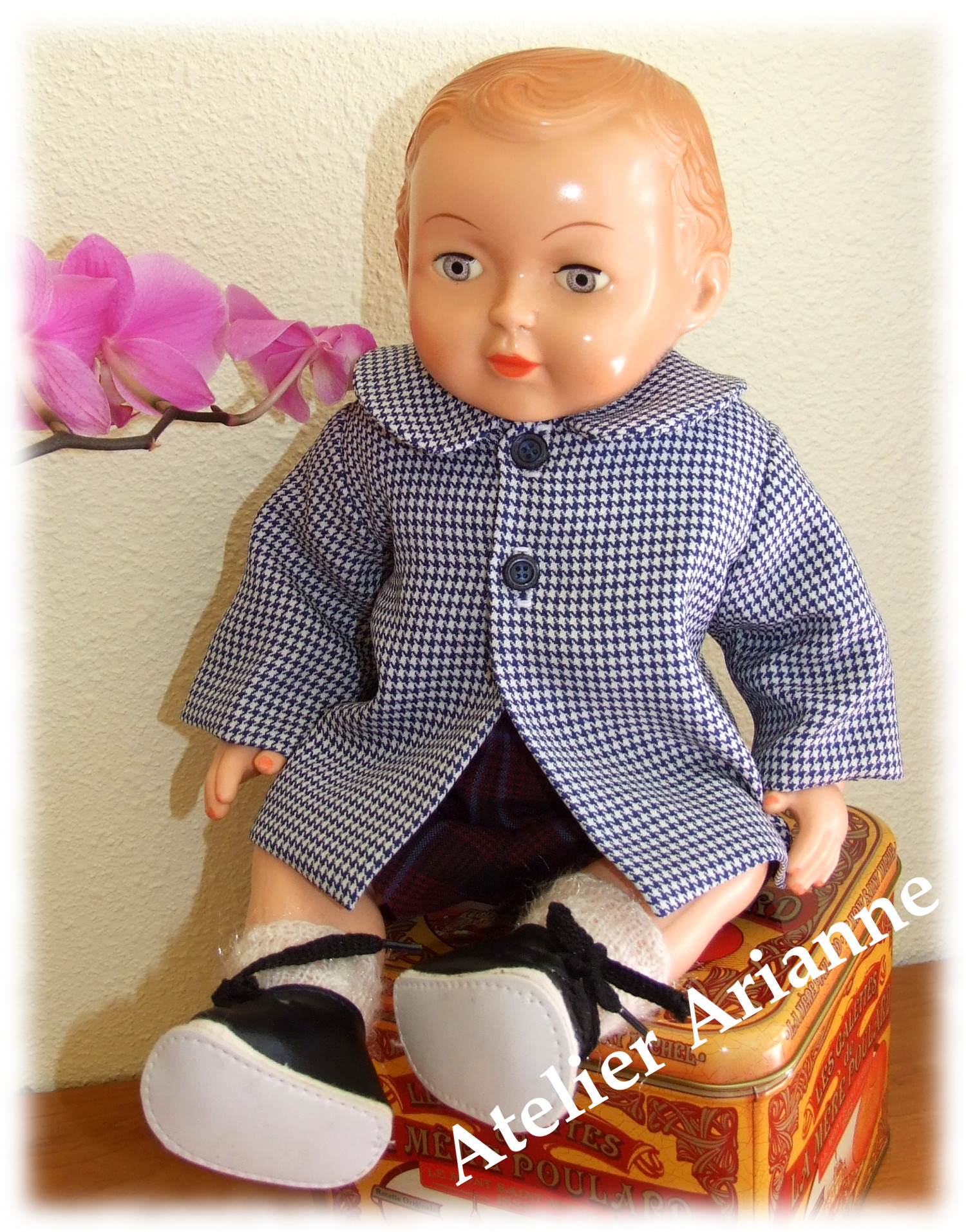 Tenue pour poupée Michel Modes et Travaux Novembre 1962 Date : Novembre 1962 Taille : 39 / 40 cm Nombre de pièces : 1 – manteau Couleur : bleu et blanc Matériau : lainage d’époque